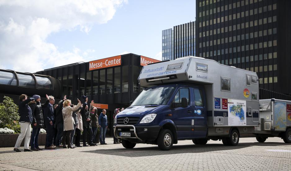 Den spektakulære reisen skjer i samarbeid med Messe Düsseldorf, som er vertskap for verdens største caravanmesse Caravan Salon. Derfor var offisiell avreise fra messelokalene i Tyskland. Følget består av 39 personer fra Tyskland, Frankrike, Østerrike og Sveits. De reisende er fordelt på 21 bobiler, og veien går delvis langs silkeruten. Etter den offisielle starten i Düsseldorf, vil de reise gjennom Berlin, Warszawa og Vilnius, og nå Riga på dag fire. I løpet av de neste ti dagene vil gruppen reise over Russland og se metropolene i Moskva og Volgograd. Så vil de reisende følge elven Volga til sitt delta nær Astrakhan. I Kasakhstan vil de krysse grensen mellom Europa og Asia. Karakalpakstan, området rundt det tidligere Aralhavet, gir innsikt i den enorme utbredelsen og ensomheten til det robuste steppelandskapet. Og dette er bare starten.