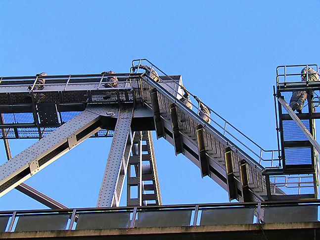 – Om alle har tisset ferdig, så begir vi oss av sted, det er knapt to timer til neste gang muligheten byr seg, var beskjeden fra guidene. Med alt utstyret på plass var det bare å begi seg ut på klatretur i Lillebæltsbroen, og det kilte i magen da vi nærmet oss brofundamentet hvor den første trappen ledet oss opp i høyden. De med høydeskrekk fikk vite at det var mulig å snu før den endelige klatringen begynner, men først måtte sikkerhetslinen på plass. Snart var vi utpå servicebroen med gitternetting under skosålene, hvor vi kunne se lukt ned i avgrunnen. Slikt gir et ekstra sug mageregionen, og man får en rask indikasjon på om dette er noe å begi seg utpå i det hele tatt.