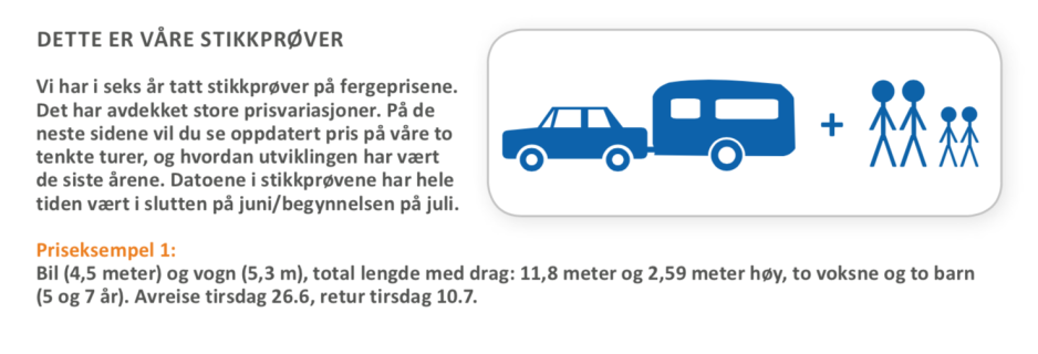 Vær oppmerksom på at mange båter har begrenset kapasitet på så høye kjøretøy som bobiler og campingvogner. Spesielt avgangene fra Vestlandet har begrenset kapasitet. For å gi et sammenligningsgrunnlag har vi laget to typiske eksempler som treffer mange av våre lesere: Paret med bobil og familien på fire med bil og campingvogn, se egen ramme med detaljer. Alle prisene er innhentet i midten på mars 2018.