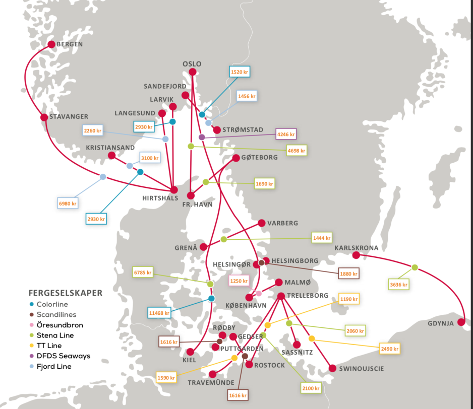 Priseksempel 1 (Helsingborg-Helsingør og Gedser-Rostock): 5590 SEK (2017: 5390 SEK, 2016: 5050 SEK, 2015: 5030 SEK)