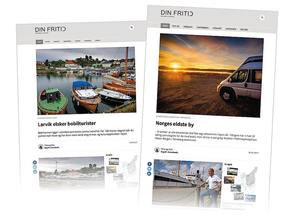 Du finner alle artiklene her på dinfritid.no, se relatert innhold til høyre. Så enten du er interessert i å lese om hvordan din nærmeste by har kommet ut eller hvor du selv bør reise, sjekk det ut. Her finner du også små videosnutter fra bobilparkeringene. Som abonnent har du tilgang til alle saker - ikke minst er dette kjekt når du er ute og reiser.