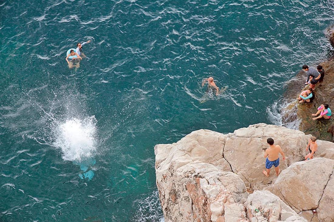 Her kan du gå til du møter bymuren, og lete etter skiltet hvor det står: ”Cold drinks, with the most beautiful view”. Da har du funnet åpningen i bymuren som går ned noen bratte trapper, og du er fremme ved Cafe Buza. Dette stedet er obligatorisk når du er i Dubrovnik. Det serveres drikke her, men det er uansett utsikten og plasseringen som gjør plassen unik. Om Dubrovnik på avstand oppleves som en by som klorer seg fast på liten plass, så blir det veldig konkret på denne kafeen. Det er egentlig ikke plass til en kafé her. Det er bare å nyte den fenomenale utsikten og opplevelsen forsterkes av de badende som viser frem sine stupe- og hoppekunster fra fjellhyllene rett under kafeen..
