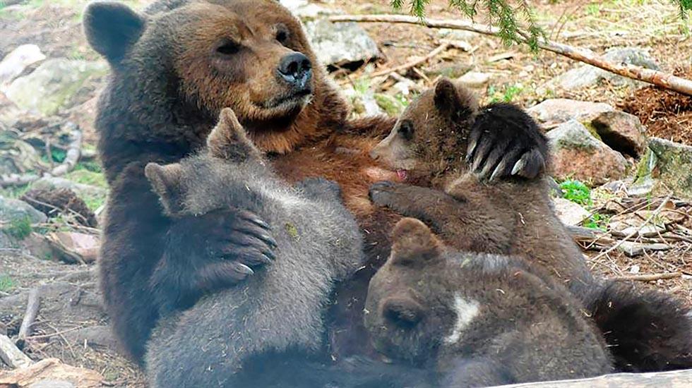Et av årets høydepunkter i Orsa Rovdjurspark er når årets bjørnunger slippes ut for å oppdage verden utenfor hiet. Årets tre unger er hanner som ble født i begynnelsen av januar, og de er nå opptatt med å være rampete og trene seg opp for voksenlivet. Mammaen dier fortsatt ungene, og har stålkontroll på dem.