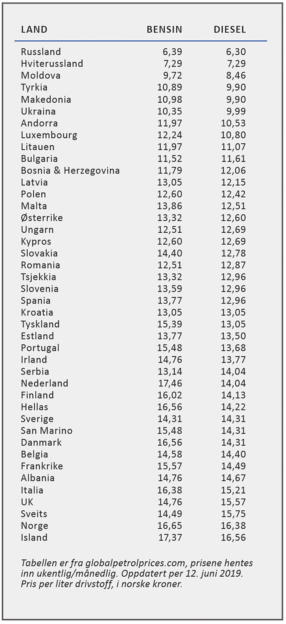 La oss si at du er i Belgia på vei sørover. Å fylle 70 liter her koster 1008 kr, om vi skal tro gjennomsnittsprisene i oversikten. Venter du derimot til du kommer over grensen til Luxembourg ender prislappen på kun 756 kr. Det er 250 kroner i forskjell!