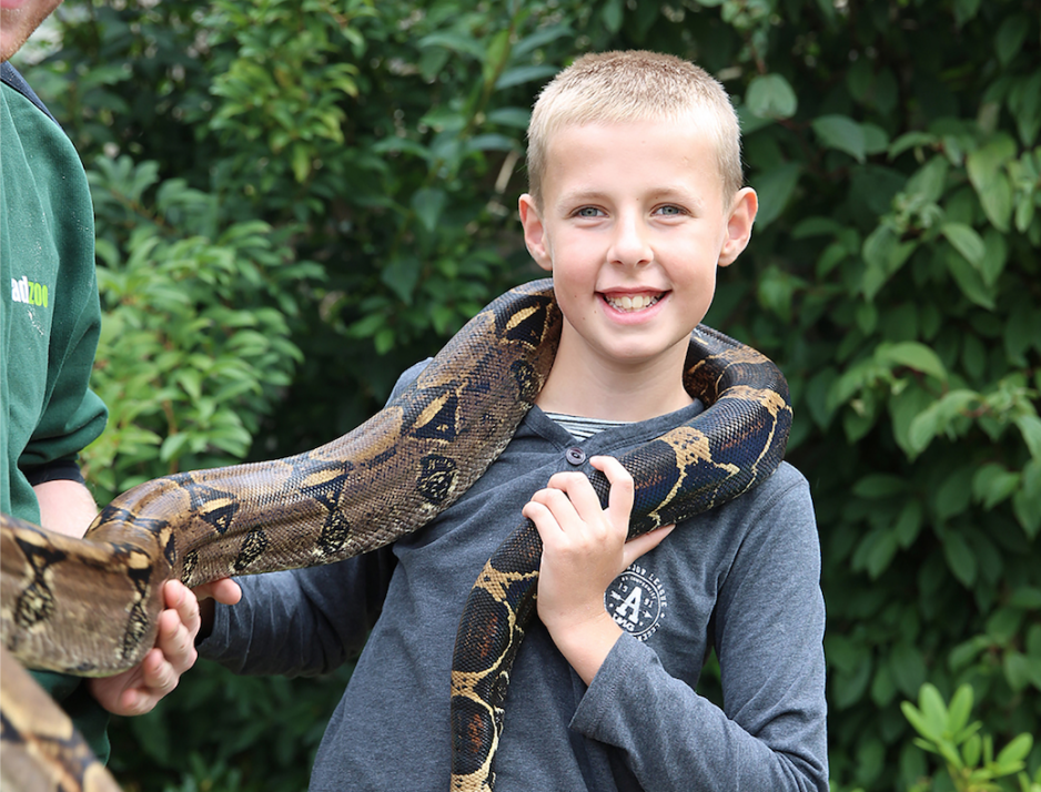 Hvilken slange tør du å holde? En liten? Eller den store? Sammen med dyrepassere i Glad Zoo i Vejen kan du komme helt tett på alle de eksotiske dyrene i «klappezoo», besøke slangenes hus og hvis du tør – holde en slange over dine skuldre.
