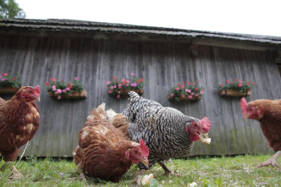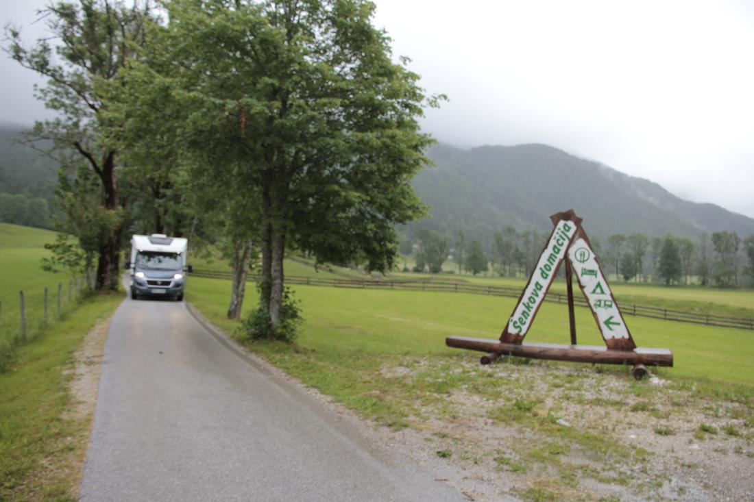 Langt mer imponerende omgivelser å skrive hjem om, fant vi hos Senkova Domacija i Zg. Jezersko (N46.4079 E14.5214). Her var det høner og hester i massevis, og et lite serveringssted. I tillegg var det toalett og dusj og benker som kunne brukes av bobilfolket. Området ligger rett ved alpenes østligste isbre, og vi fikk kjenne på den friske og kalde fjelluften - selv i juli. Her kan du gå spektakulære fotturer ved foten eller til toppen av de imponerende fjellene i området. Dette er likevel ikke den eneste aktiviteten som foregår, vi havnet midt i et lokalt sykkelritt - en idrett som er svært populær i området sommerstid. På vinteren er det normalt mulig å stå på ski her, og mange går langrenn. Vi skulle videre nordover til Østerrike og snirklet oss videre på den smale veien som var full av blide sykkelamatører.