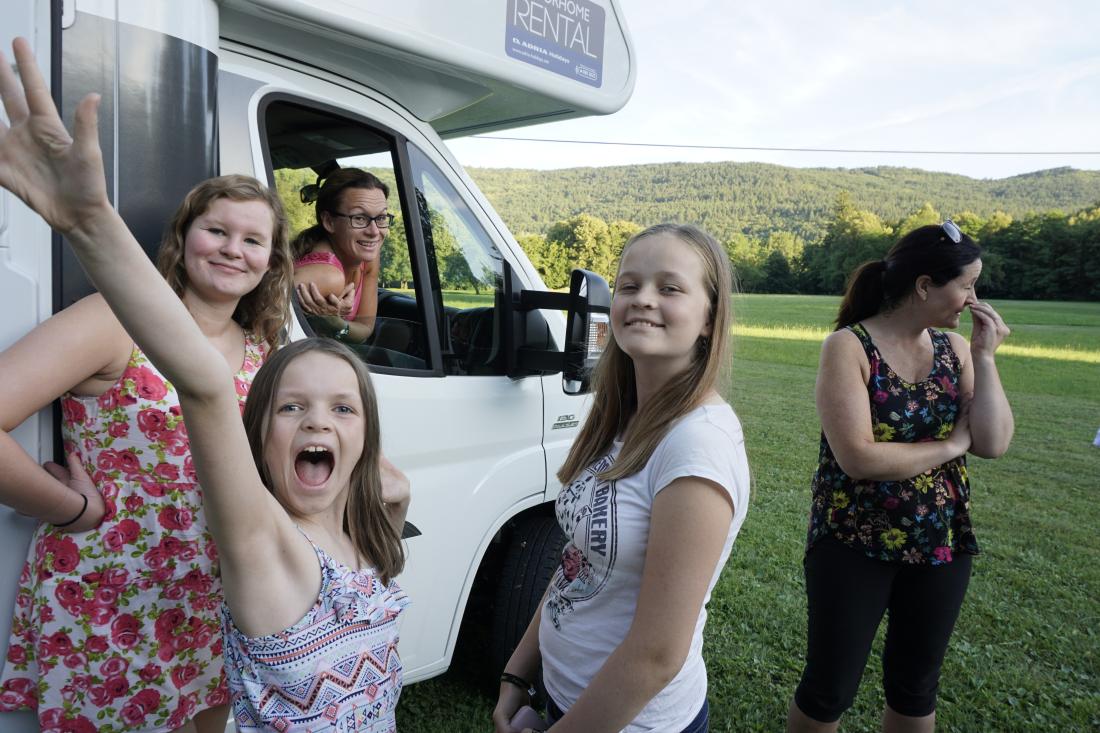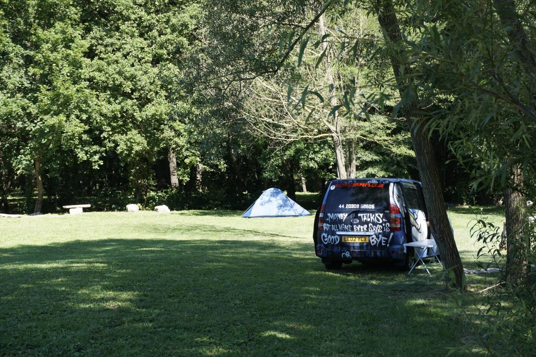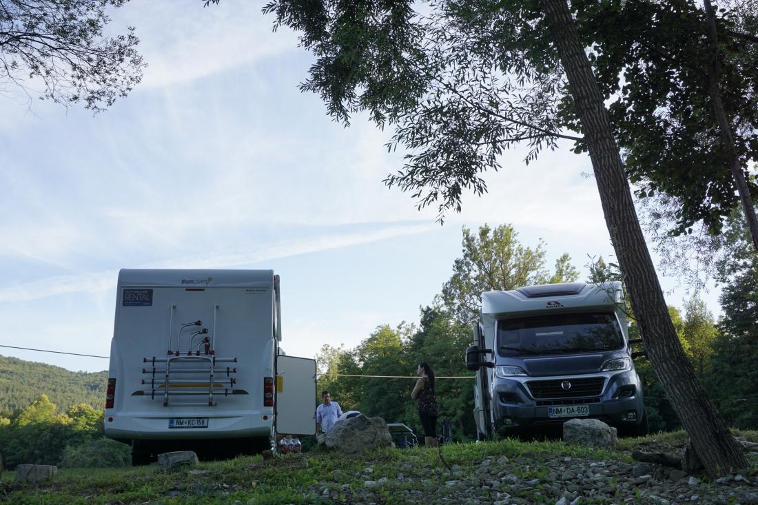 Da vi var i grottene Skocjanske Jame overnattet vi hos Emilijana Lipovšek på campingplassen Dujčeva domačija (N 45.6553°, E 14.024911°). På den store plassen med elven rundt var det god plass, stille og rolig i begynnelsen av juli.