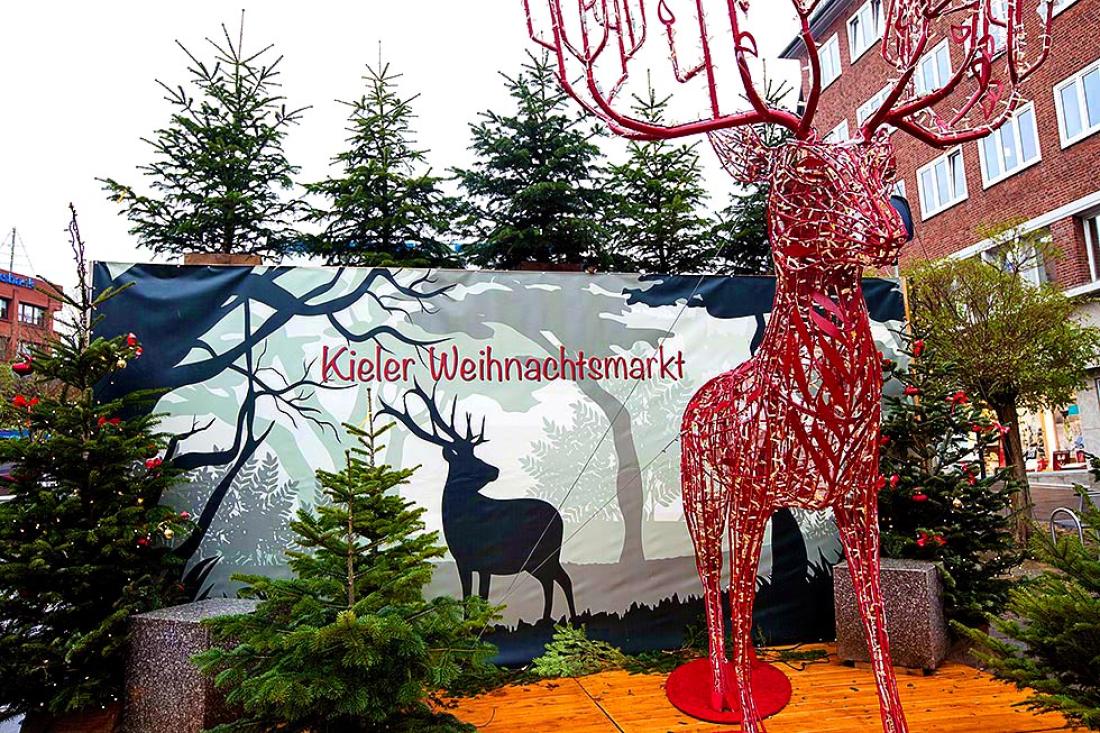 Siden 1973 har julemarkedet i Kiel gitt lys, varme og glede til de lokale og tilreisende. I perioden mellom 25. november til 23. desember kan du oppleve julemarkedet på 5 forskjellige steder i byens sentrum. Her kan du stoppe opp og stresse ned i den travle førjulstiden. Det er lov å la seg forføre av engelske julesanger og av de mange gode luktene fra søtsakene på markedet. I det kompakte sentrum kommer du enkelt rundt til fots. Fra Holstenplatz, der gågata starter, ligger julemarkedene som perler på en snor langs Holstenstrasse. Her ønsker en syngende elg deg velkommen til Kiel. Julemarkedet gjør så en sving inn Asmus-Bremer-Platz og fortsetter til torget utenfor Rådhuset. Ved Asmus-Bremer-Platz står en 12.50 meter høy attraksjon i form av en pyramide bygget i fire etasjer. I en sirkel rundt pyramiden selges det mye god mat og drikke. Det oser av gode lukter fra bodene. Her er det plassert ut bord og benker hvor du kan sette deg ned og nyte maten. Da er det enkelt å komme i kontakt med folk som er i samme ærend som deg. På Rathausplatz er det karusell for barna, og en del andre morsomme aktiviteter. Det er på kveldene at julemarkedet virkelig kommer til liv. Da kjører reinsdyr med slede på himmelen over Rådhusplassen, og er du heldig kan du få se julenissen i Kiel også. I enden av gågata kommer du til markedet på Alter Markt hvilket er et noe mindre og mer kompakt torg.