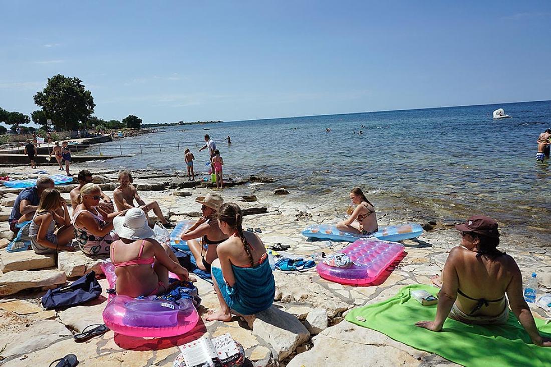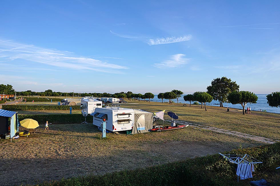 Vi er to ekvipasjer i følge, og vel etablert på plassene våre gleder barna seg over at det er kort vei til det innbydende Adriaterhavet. Våre plasser, som etter eget ønske er nærmest mulig havet, har ikke trær til beskyttelse for den hete sola. Noe av det beste med stedet, er at du kan få plasser som er godt tilbaketrukket og ligger skjermet mellom skyggefulle trær, eller så kan du som oss solsultne turister ønske deg så nærme havet som mulig.