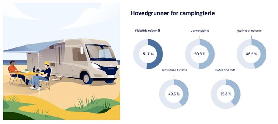 Disse grunnene ble oppgitt for camping som en alternativ ferieform: Deltakerne liker muligheten for å reise til forskjellige steder (52%), at man er uavhengig under reisen (51%) og nærhet til naturen (47%). Andre viktige grunner at man reiser alene og unngår grupper av mennesker (40%) og muligheten til å prøve noe nytt (40%). Den lave smitterisikoen spiller også en rolle. 30% av de spurte ser på dette som et argument for en campingferie - like mange som forventer at campingvognen er en effektiv måte å fjerne seg fra en stressende hverdag. Samlet sett er holdningen til den mobile formen for ferie ekstremt positiv: Totalt 43% av alle de som deltok Europa kan tenke seg campingferie i løpet av de neste tre årene.