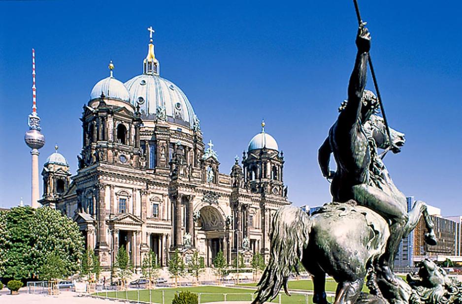 Ved elven Spree finner man katedral Berliner Dom, med klassisk vakker arkitektur.