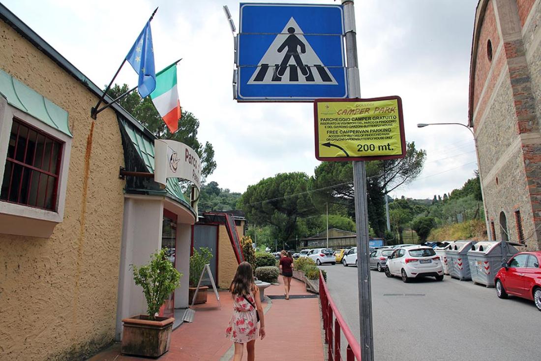 Parken ligger en tre kvarters kjøring nord-øst for Pisa. Vi kommer til parken ved lunsjtider og er svært spente på hva som møter oss. Det er god plass på parkeringen, og rett ved er det også en bobilplass hvor man kan overnatte til en fornuftig pris.