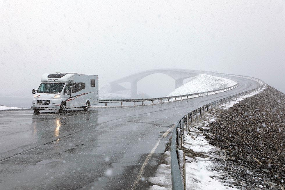 Jeg fikk et lite forvarsel da værmeldinga antydet en del regn de neste dagene. Likevel må jeg si jeg ble overrasket da jeg kjørte ned europavei 136 fra Dombås til Åndalsnes. Her var det ikke regn, her var det snø. Landskapet som møtte meg var hvitkledd. Og mer snø skulle det bli: Store hvite flak drev fløy vannrett i den økende vinden. Det røsket i bobilen hver gang den kom i åpent lende.