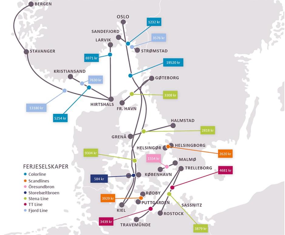 NB! Det er viktig å innhente og sammenligne dine egne priser for din tur, men med vår oversikt og våre tips slipper du forhåpentligvis å sjekke alle selskap. Prisene er innhentet fra ferjeselskapenes offisielle nettsider 10. og 14. mars, og må ses på som dagsferske da ferjeselskapene kontinuerlig justerer prisene etter etterspørselen.
