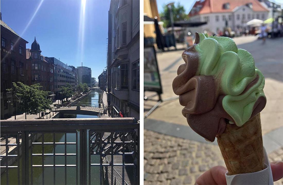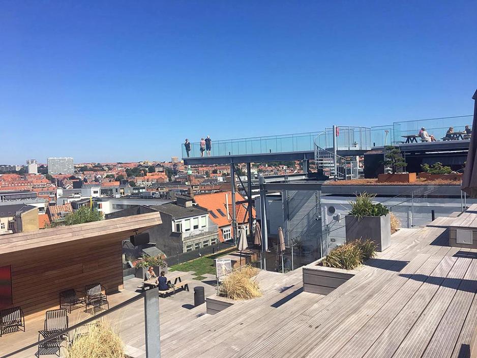Turen videre gikk langs kanalen som går gjennom byen, hvor det også er et yrende liv og tett i tett med uterestauranter og butikker. Jeg anbefaler på det sterkeste å ta turen opp til den prisbelønte takterrassen på varehuset Salling, som ligger midt i sentrum. Her finner du restaurant med uteservering, et av byens beste utsiktspunkter, og ikke minst har de laget et utspring med glassbunn hvor man gå ut og kikke ned på folkelivet, mange meter under deg.