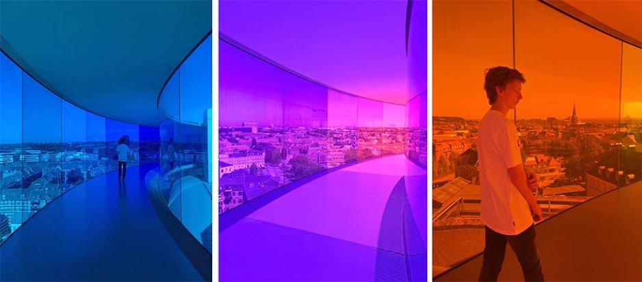 Slik oppleves det å bevege seg inne i glassinstallasjonen på taket av AaROS - "Your rainbow panorama". Etterhvert som du går endrer byen seg i alle regnbuens farger.