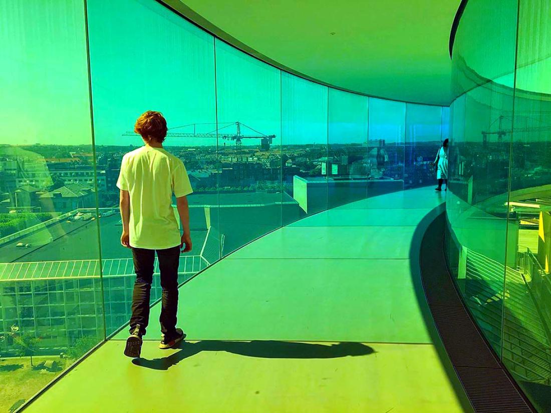 Turen var ikke så nøye planlagt, men vi hadde bestemt oss for et par ting vi ville ha med oss. Første stopp var ARoS, hvor vi hadde satt av en hel dag. Vi har vært her en gang før, men hadde da kun et par timer til rådighet. Dette er et av Nord Europas største kunstmuseer og et av de mest besøkte i Skandinavia. For oss var bare det å få gå i den gedigne «Your rainbow panorama» nok en gang, verdt besøket. Dette er en installasjon som er montert på taket av museet. En 360 graders glasstunnel i regnbuens farger, hvor man kan gå runde på runde og få en spektakulær utsikt over hele byen.