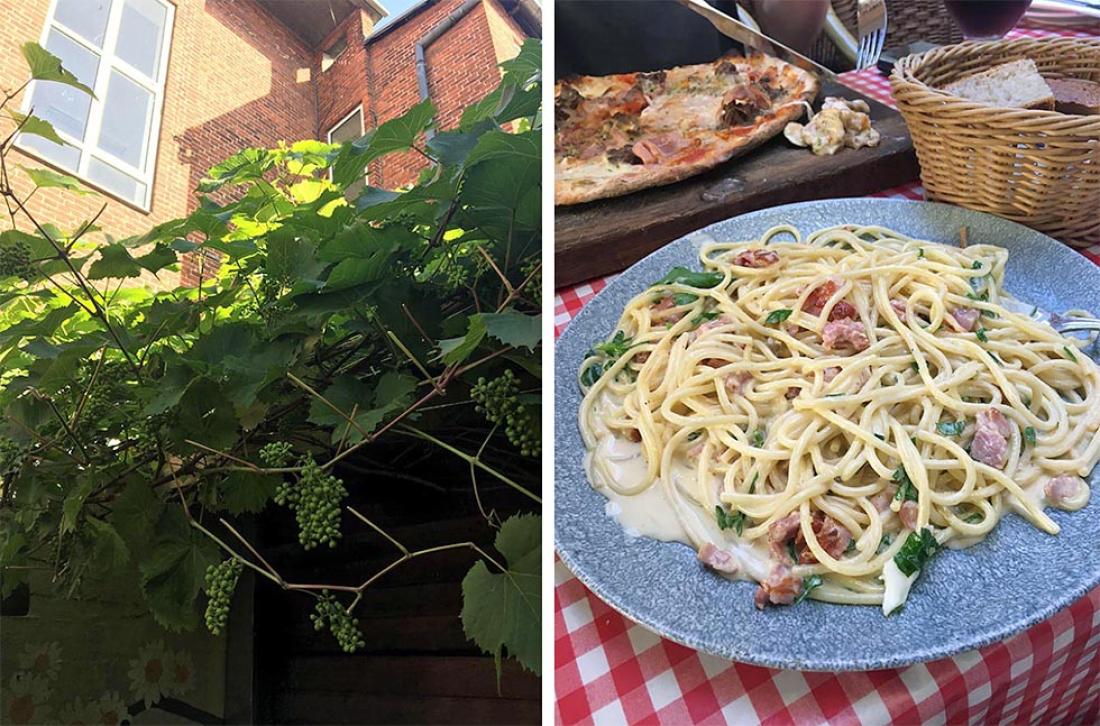 Da magene våre ga beskjed om at nok er nok, landet vi på en bitteliten restaurant i en gammel bakgård. Veggene var dekket med vinranker og druer i overflod hang både høyt og lavt på veggen. God stemning, god service og ikke minst god mat ga oss ny energi.
