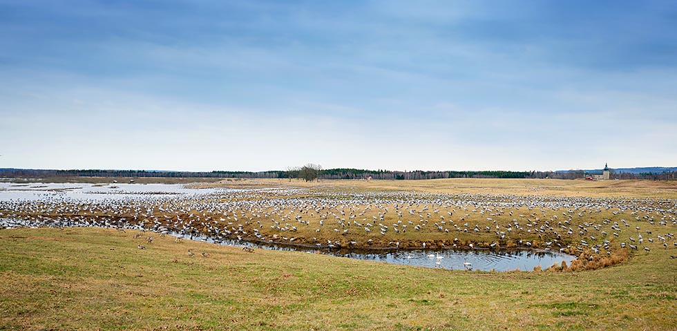Et besøk til Hornborgasjø hadde alt for lenge stått på min ”må vente til neste tur”-liste. Men i påsken i fjor ble det alvor av planene. Forholdene er godt tilrettelagt for bobilturister, var vi blitt fortalt via mellommenn. De tusenvis av tranene som trekker her er en turistmagnet og rundt 150 000 besøkende kommer til våtmarksområdet i løpet av en sesong.