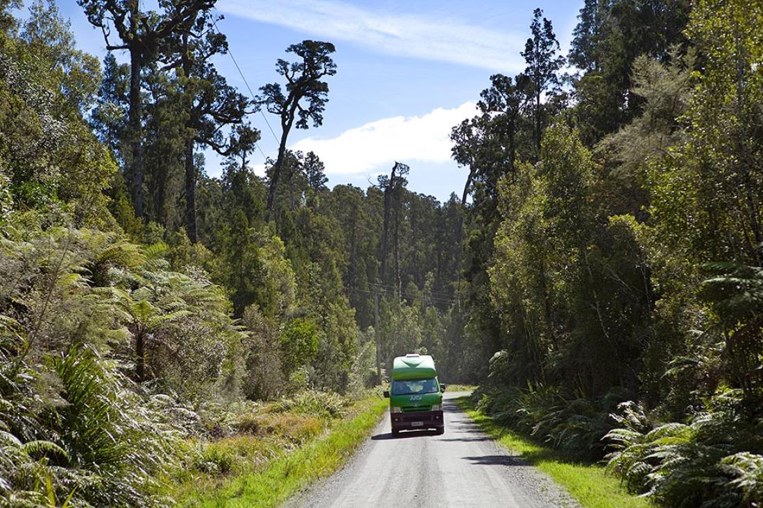 Veikartet informerte oss om at hele vestkysten av Sørøya var bedekket med nasjonalparker. Ett av de viktigste salgsargumentene for å reise hit var storslått natur. Vi satte kursen ut på vei 6. De sørlige alpene presenterte seg med krystallklart fjellvann og elver med snødekte topper som bakteppe. Solen malte et fargebilde med toner av indigo på sin nedadgående ferd bak den taggete horisonten. New Zealand leverte. Ferden tok oss videre ned i lavlandet hvor landskapet forvandlet seg til en frodig grønn skog. Mørke trær steg opp på hver side og skyggela veien, hengende over asfalten på et trolsk vis, som om de prøvde å hjemsøke passeringen av alle kjøretøyene.