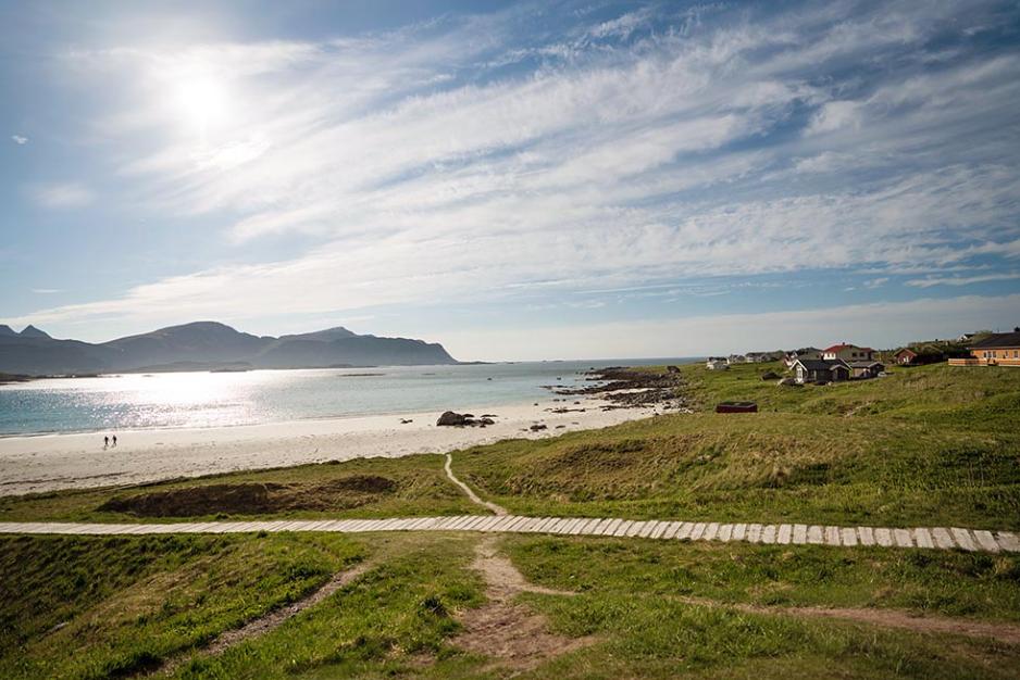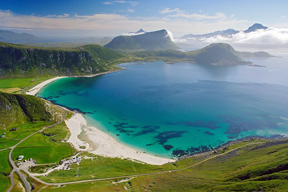 «Lik ryggraden på en drage reiser Lofoten seg opp av Norskehavet. Øyene er den arktiske drømmen, enten du opplever den i det evige lyset fra midnattssola, eller i dansende nordlys og hvit snø. Hauklandstranda er utenomjordisk, med spisse granittfjell som stikker opp over kremet sand og safirblått hav. Vannet er kjølig (når aldri mer enn 15°), men du vil likevel klø etter å hoppe ut i det.»