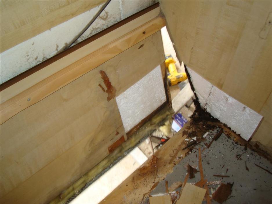 Det eneste problemet med denne vognen var litt fukt i den bakre delen av vognen. Heldigvis er både Jesper og hans far flinke med hendene. Jespers foreldre har også campet i mange år, så de er erfarne med campinglivet. Jesper har sammen med sin far åpnet vognen bak for å skifte ut råttent treverk med nye treplater. Det ser voldsomt ut, men operasjonen er ganske enkel.
