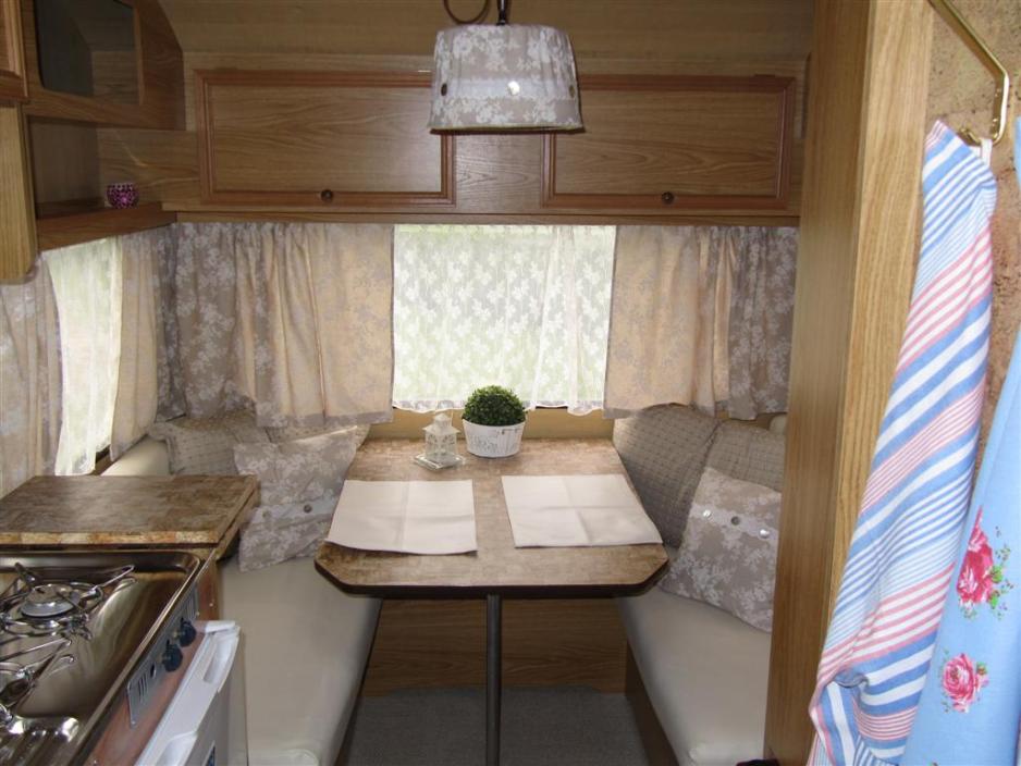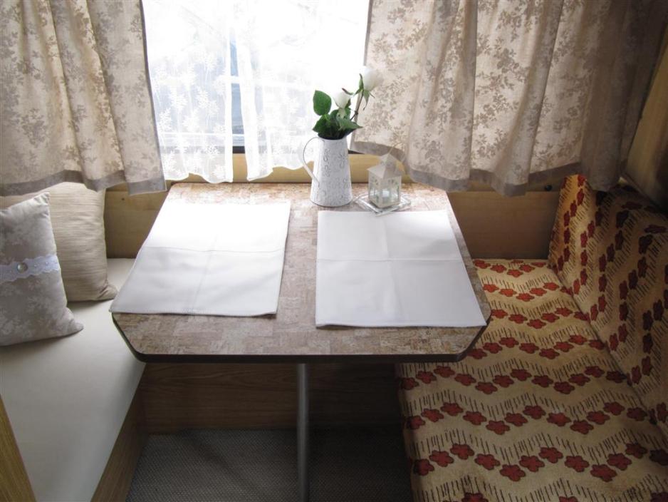 Innvendig var campingvognen før mørk og kjedelig. Gulvteppet var mørkt. Det samme var gardinene og polstringen var mørk med store blomstermønster. Det er nå borte alt sammen. Rikke har sammen med sin mor vært utrolig kreativ ved symaskinen. Det er sydd nytt trekk, lampeskjermer, gardiner, puter og mye mer. Campingvognen oser av hjemlig hygge og romantikk. Det er virkelig flott gjort.