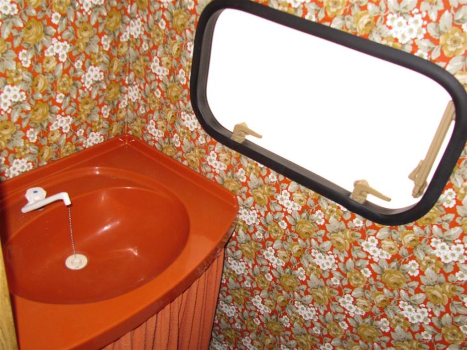Toalettet er ekstremt lite og det eneste stedet, der det bare er gjort ganske lite. Det er hengt opp et speil og så har Jesper planer om å flytte vannbeholderen inn under vasken, fordi gasskassen, der den står nå, er veldig liten. Det krever bare, at det settes opp en liten hylle.