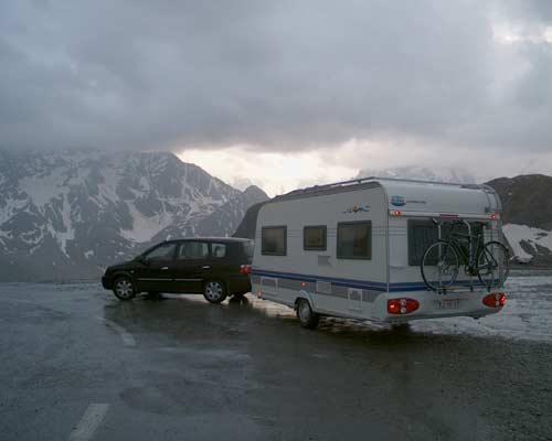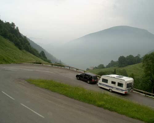 Campingplasser i fjellene: Det er ikke alle campingplasser oppe i fjellene, som har plass til campingvogner, og noen ganger er det dårlig markert med skilt. Sjekk i campingbøker eller kontakt plassen for å være sikker. Generelt sett er veiforholdene bedre i Alpene enn i Pyreneene, noe som primært skyldes et godt utbygget veinett til skisportsstedene. Husk at fordi du leser, at et vogntog kommer greit over et fjellpass, er det ikke sikkert ditt vogntog kan. Det kommer an på, hvor mye overskudd din motor har og selvfølgelig, hvilket pass du skal over.