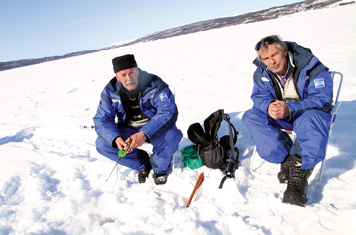 Stuggusjøen bader i sol. Ikke et vindpust kan forstyrre idyllen. En halv meter snø og nesten en meter tykk is skiller to hundre isfiskere fra vannmassene. – Jeg drar på fisketur hver eneste helg, forteller Per Inge Iversen. 52-åringen bor i Selbu, og er blant dem som har kortest vei for å komme til campingvogna som står plassert på Stugudal camping, noen hundre meter fra Stuggusjøen. Sammen med kompisen, Jon Håvard Hulmo fra Singsås i Sør-Trøndelag, har Iversen satt seg godt til rette på en fluktstol et stykke ut i Stuggusjøen. Litt småpludringer blir det mellom karene, mens de venter på storfangsten. – Jeg drar omtrent alltid hjem med fisk. En gang fikk jeg en ørret på et par kilo, men for det meste fisker jeg røye.