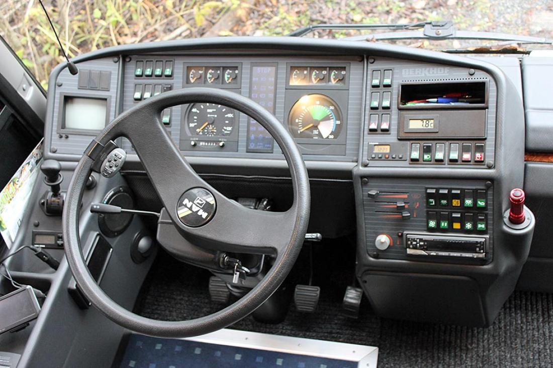Sjekkpanelet er noe mer omfattende enn vanlig. Det kostet over 40 000 kroner og kommer fra Mastervolt. Summen det har kostet å bygge bobilbussen tilsvarer en bobil i superklassen. Men hadde Tom kjøpt seg ferdig bobil hadde han jo gått glipp av all moroa med å lage teknikken som ligger på et meget høyt nivå. Sjekkpanelet kontrollerer og betjener mange funksjoner, blant annet er ladesystemet datastyrt. Ladingen fra 230 volt må reguleres etter sikringsstørrelsen på de forskjellige campingplassene. Laderen på 2,1 kW sammen med vannvarmeren krever en 16 A kurs, og i tillegg kommer eventuelt klimaanlegg. Panelet viser hvor mange ganger batteripakken er blitt utladet ned til en viss prosent, videre hvor mange amperetimer og tid som gjenstår av strømforsyningen. Angitt tid endres selvsagt etter hvordan strømforbrukere skrus av og på. Motoren leverer 120 A ved 24 V (nesten 3 kW). Gass er droppet, Tom har kompressor kjøleskap, diesel kokebluss fra Wallas som for øvrig går på lampeolje, videre Webasto dieselvarmer på 30 kW fra Berkhof. En ulempe med denne er at eksosrøret vender ned mot bakken og svir av et område på plenen under drift. Ellers er den meget effektiv, og kan varme bodelen i egen krets, eller også ta med motoren. Det er til sammen 15 meter konvektorer innvendig og de avgir 850 watt per meter. Da er det nok varme igjen til motoren. Vannvarmeren på 17 liter er tilknyttet sentralvarmen og varmes derved av både motoren og Webastoen, i tillegg kan den varmes på 230 V.