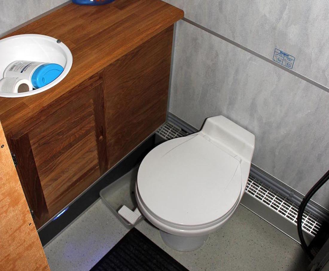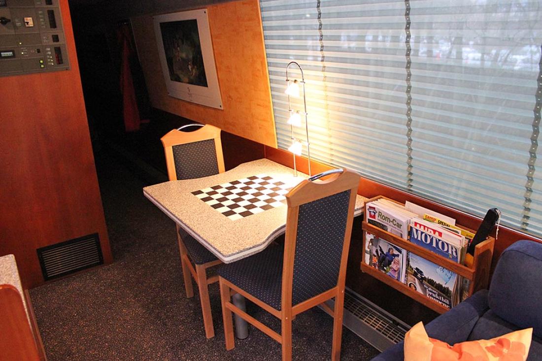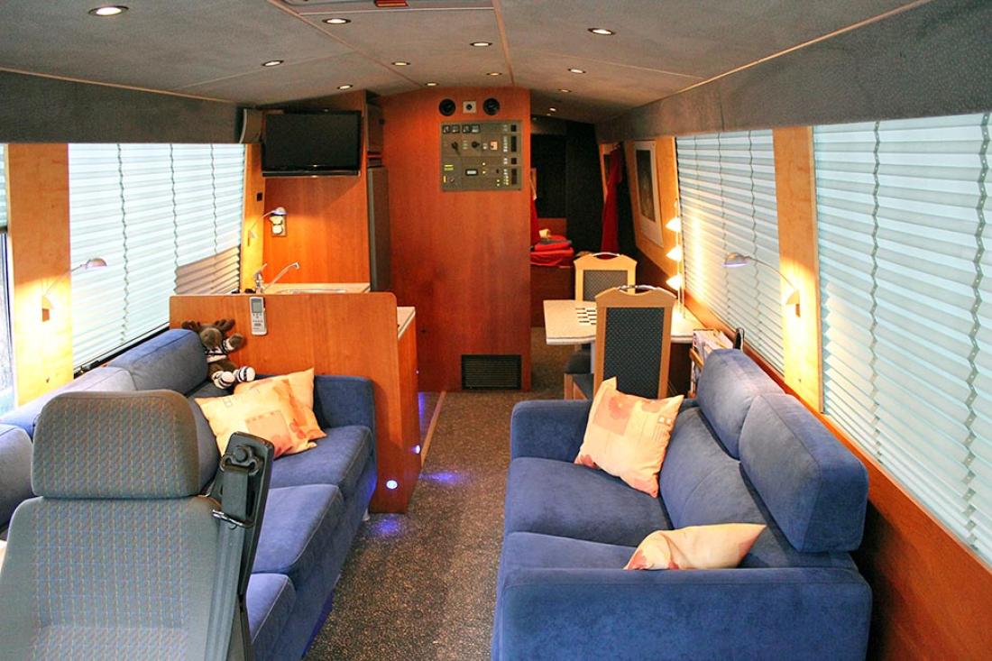 Vi kan forsikre at å konstruere og lage disse innretningene tar sin tid, men etter en del arbeid var prosjektet klart for å bygges inn. Men også her ønsket Tom utradisjonelle løsninger. I stedet for en typisk bobil, ønsket han en bobil forkledd som buss. Det gir adgang til bussparkering i byer og andre fordeler gitt turisttrafikk. Valget falt på hollandske Berkhof, en produsent av luksus turistbusser. Dette var byggenummer 3685 på fabrikken og første bussbygg spesiallaget for campingbruk. Utvendig ser bussen akkurat ut som en annen buss, men innvendig ble det gjort en del endringer. Blant annet var gulvet plant, uten forsenkning i midtgangen. Videre fikk Tom montert inn kraftige veltebøyler som tåler at bussen ruller. Dette utgjorde en ekstra vekt på over 300 kilo. Frontruten på over fem kvadratmeter er også en sak for seg, heldigvis har den ”bare” røket en gang, så langt. De store sotete sidevinduene er doble og gir det typiske busspreget. I 1998 ble chassiset sendt med båt til Holland, og etter fire måneder var bussen ferdig utvendig. Tom kjørte den så hjem, snekret en provisorisk innredning og fikk den registrert for fire personer. Foran ble det montert tre seter med plass til det fjerde. Dette var seter fra Isringhausen med luftfjæring og med justering opp/ned, korsryggstøtte og sidestøtte - alt med trykkluft. Så kommer salongen, to sofaer fra Ekornes med høydejusterbare nakkestøtter som er boltet ned i gulvet. Bakenfor finner vi kjøkkenet på den ene siden og spisegruppen for to på den andre. Både benkeplaten og bordplaten ble laget i spesialmaterialet Corian, ved en norsk fabrikk. Videre kommer sanitæravdelingen og bakerst soveværelset.