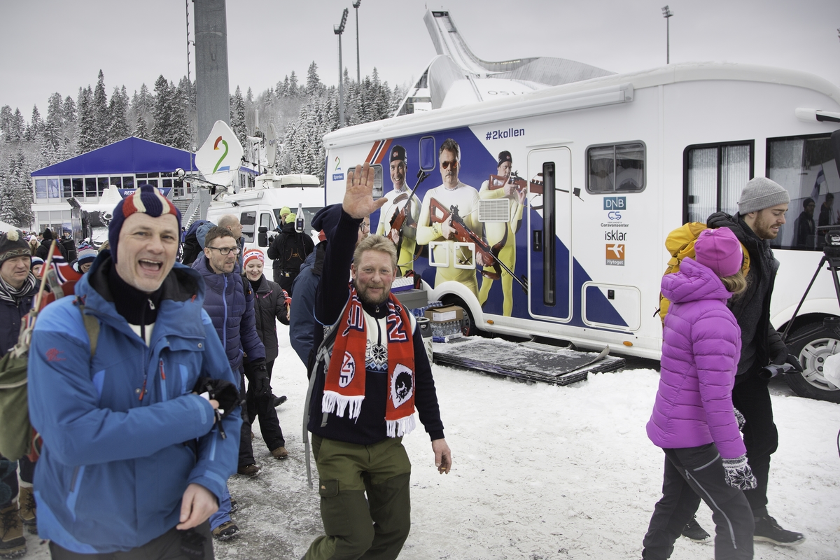 – Konseptet med bobilen her 100% prosent galskap satt i system, men som utestudio 24 timer i døgnet er det fint, sier en populær og lattermild reporter Harald Bredeli. Bredeli skal dele oppgavene sine med å arbeide 50% i bobil-studioet og 50% reporter ute på arenaen. Bredeli forteller at bilen er plassert slik at det meste av publikum må passere TV2-bobilen når de skal opp til løypene, så TV-studioet blir sett av de fleste. – Men, alt er ikke bare enkelt. For eksempel, skal vi bare ut en tur for en liten pause blir vi overfalt av publikum som vil ta selfies med oss foran bilen. En pause på fem minutter blir fort til 20 minutter. Så vi må ”rømme” området og finne oss en bortgjemt plass, sier Harald.