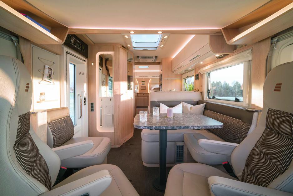 Den tyske luksusprodusenten Concorde har lenge hatt modeller med rundsittere, og det finnes flere virkelig lekre løsninger med en helt spesiell nærhet mellom sofa og kjøkken. Det gjelder også den nye løsningen på Carver 791 RL, hvor den ene enden på u-sofaen møtes av den langsgående kjøkkenbenken. Treverk og fargevalg er forholdsvis konservativt i sitteområdet, mens kjøkkenet i helhvitt ser friskt og moderne ut. I front er det senkeseng med langsgående senger og godt med plass. I midtpartiet er det baderom og dusj, med omkledningsmuligheter og skapplass. 791 RL er en attraktiv luksusmodell for to personer.
