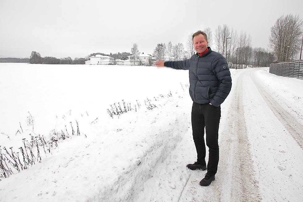 Din Fritid er med Sel, grunneier og bonde Tore Skogvold og representanter fra Norges Varemesse på visning av området, som er et stort jorde. Plassen ligger nord for Åråsen fotballstadion, rett ved et stort solcelle-anlegg. Det er snø og hutrende kaldt, men i september vil det være nyslått gras på det 110 mål store området - hvor det er plass til hundrevis av ekvipasjer.