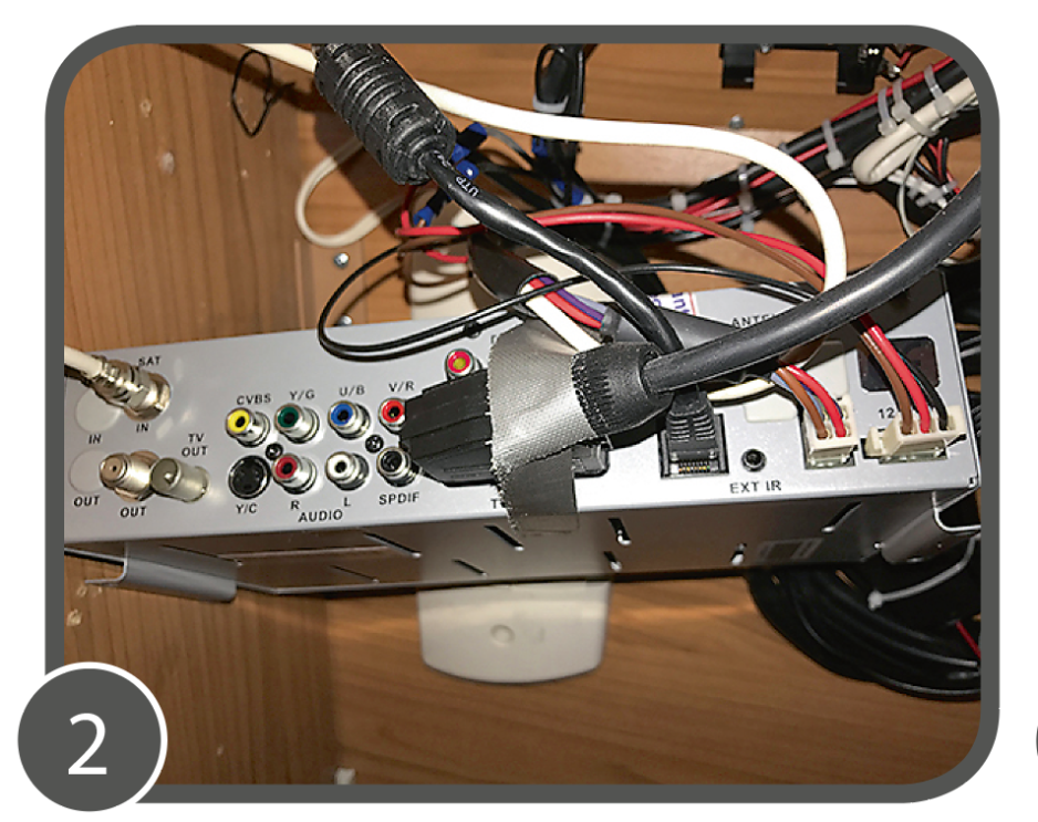 Se bilde for hvordan feste på HDMI- kabel for retur med hyssingen - bruk tape på enden. Vedlagte Oyster HDMI-kabel var veldig kraftig og vanskelig å få igjennom uten å måtte demontere for mye av bobilen. Valgte derfor å bruke en veldig tynn HDMI- kabel fra f.eks. Apple eller Belkin (tilgjengelig i vanlige elektrobutikker)