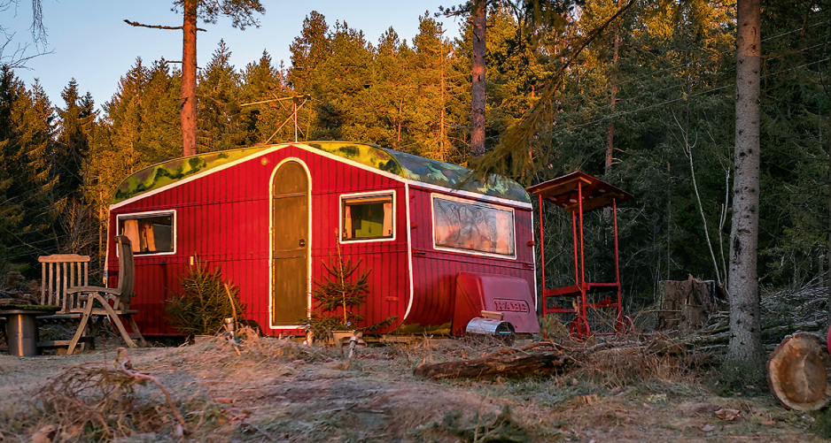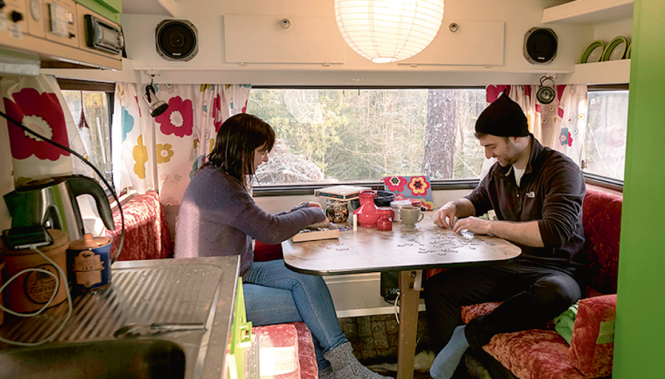 – Turen i leiebil fra Torp gikk raskt. Vi dro innom Oslo, men det var fort gjort. Det var ikke mye å se, og vi lengtet etter stillhet og ro, forteller Jenny, mens hun og kjæresten legger et puslespill fra 70-årene i den 70-talls innredede campingvognen. Interiøret er helt gjennomført, til og med musikken er fra riktig tidsepoke.