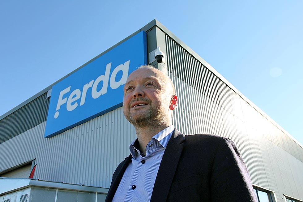 – Vi har fått låne to arbeidsplasser i kontorlokalet til våre eiere, Adolfsen-gruppen, forklarer han. Det meste av arbeidstiden min er jeg på reisefot. I snitt bruker jeg fire av fem dager ute hos forhandlerne. Ferda har ikke noe hovedkvarter, vi er to personer som er sentralt ansatt og holder til i Oslo. Alle andre funksjoner er ute hos forhandlerne. Det er viktig for oss å holde alle kostnader nede.