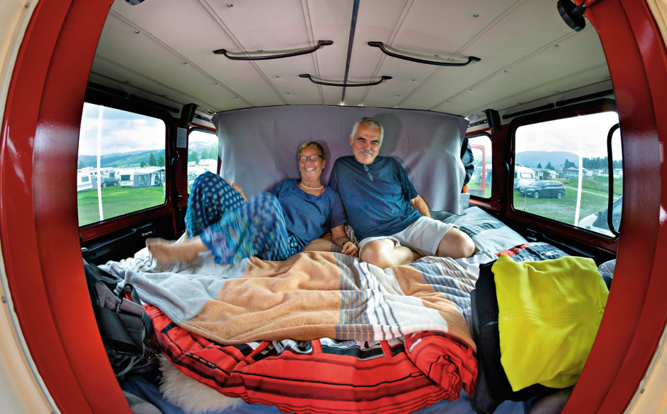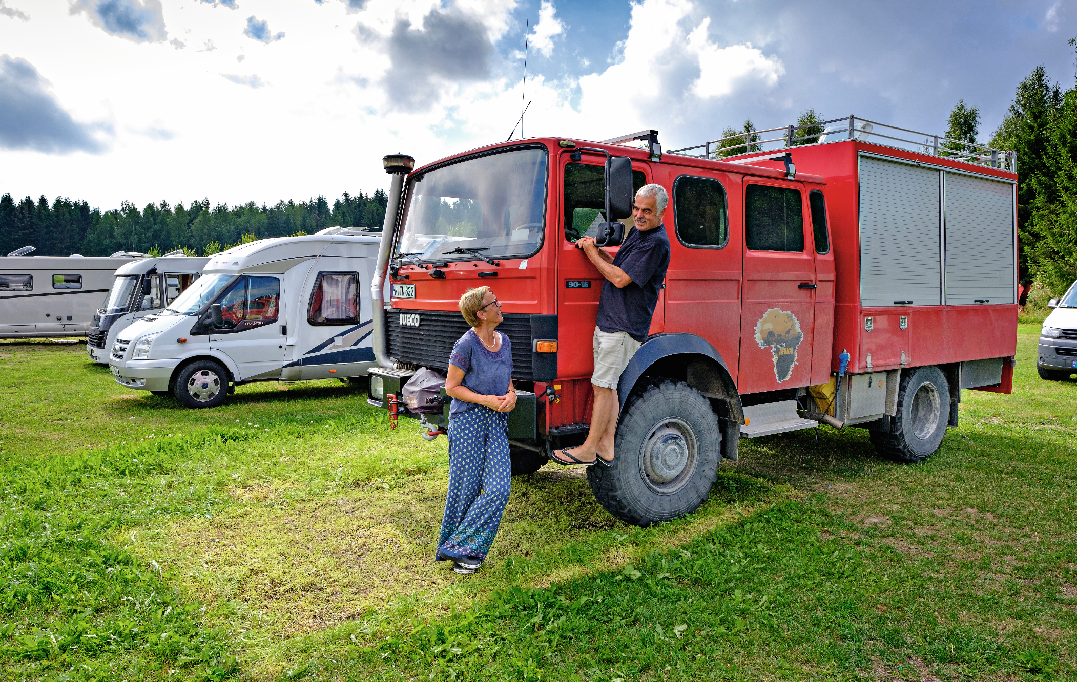 Klatrende ned fra denne høyreiste bilen treffer Bobil & Caravan Theo Weik og Erika Kempf fra Erlenbach, ikke langt fra den tyske byen Stuttgart.