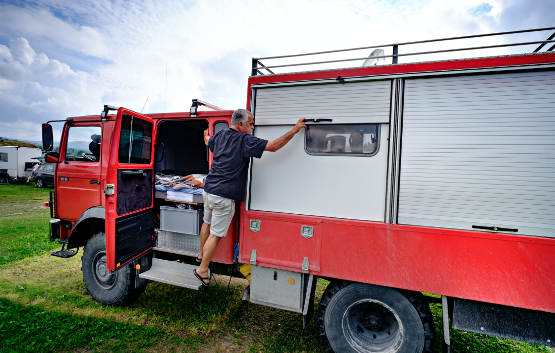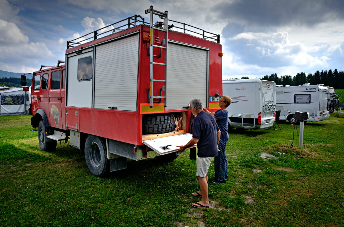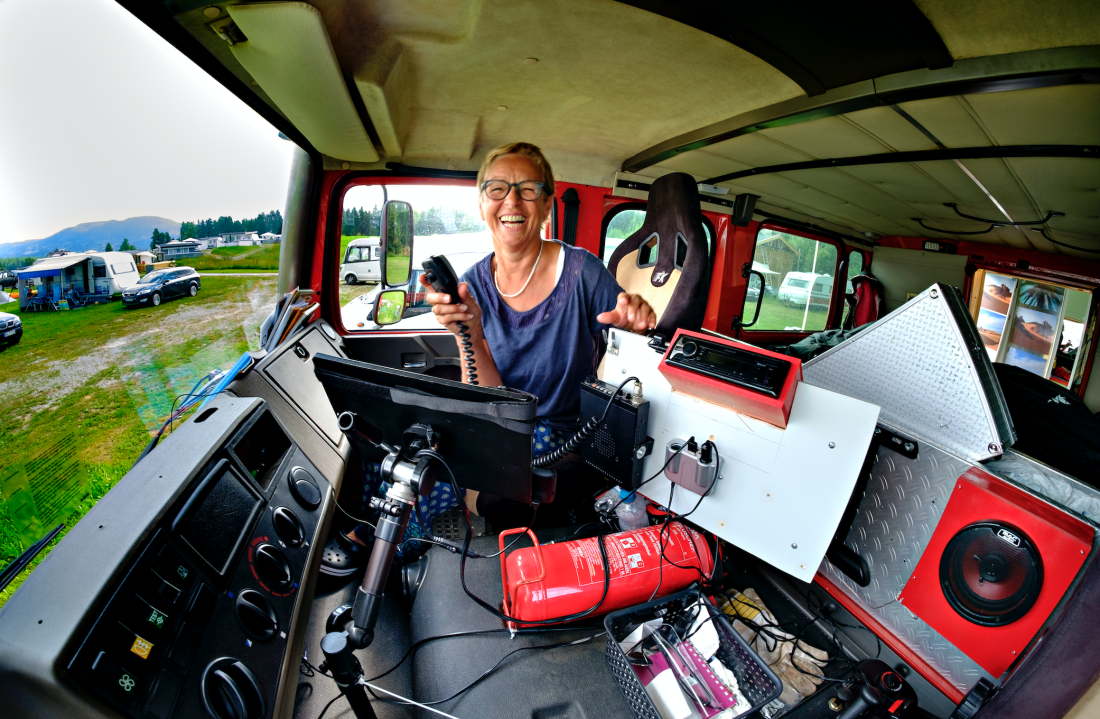 – Brannbilen er en 1990-modell Iveco, og ble brukt på en brannstasjon i en liten landsby i Tyskland frem til 2013. Den ble ikke kjørt mye, og hadde bare 30 000 kilometer på speedometeret da vi kjøpte den. Nå har den gått ti tusen kilometer mer, men bilen klarer sikkert det tidobbelte, forteller Erika ivrig.