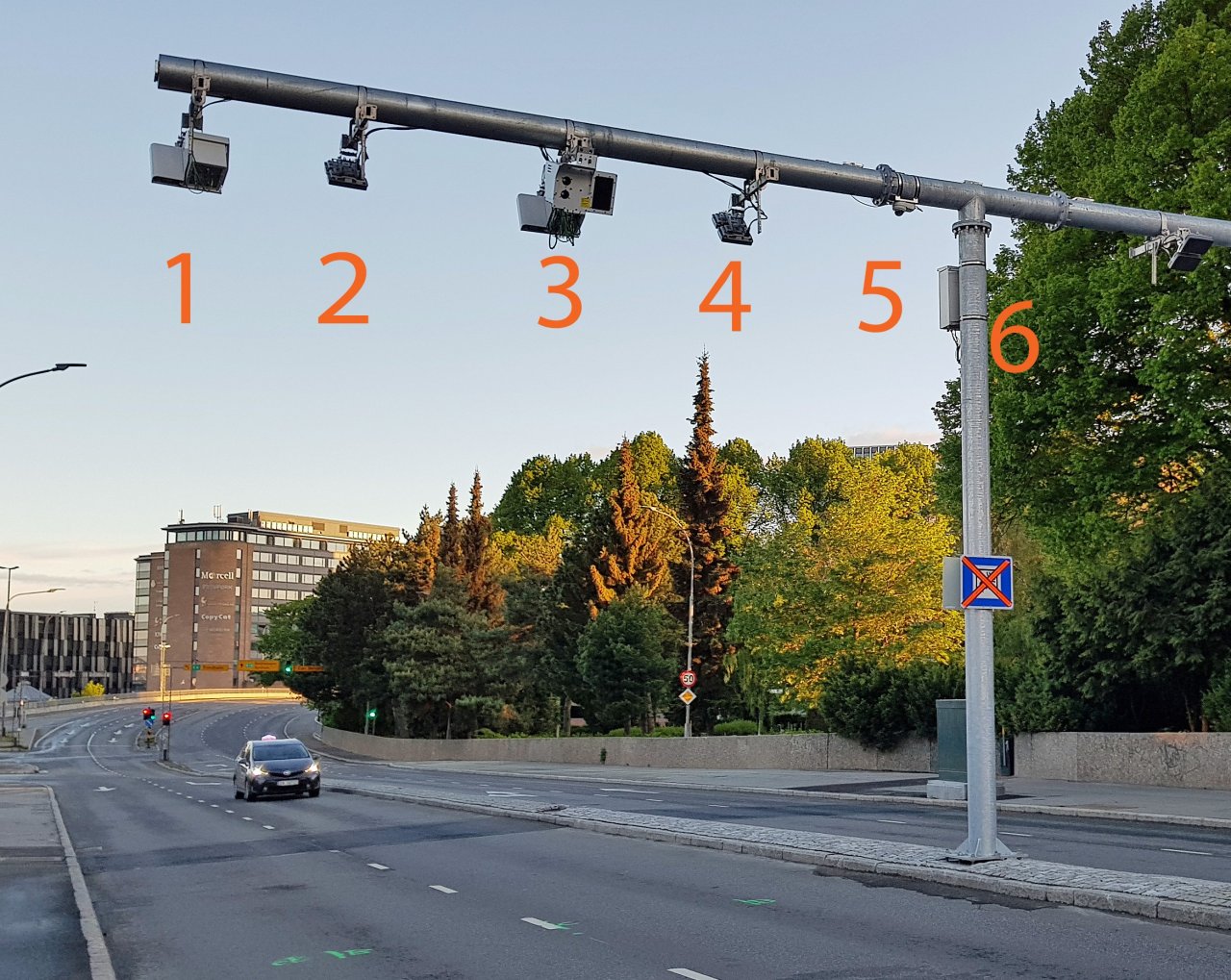 Noen lurer på om det foretas fartskontroll i bomstasjonene. Det er ikke riktig. Men det mangler ikke på teknisk utstyr, på bommen høyt over veien sitter seks ulike innretninger: