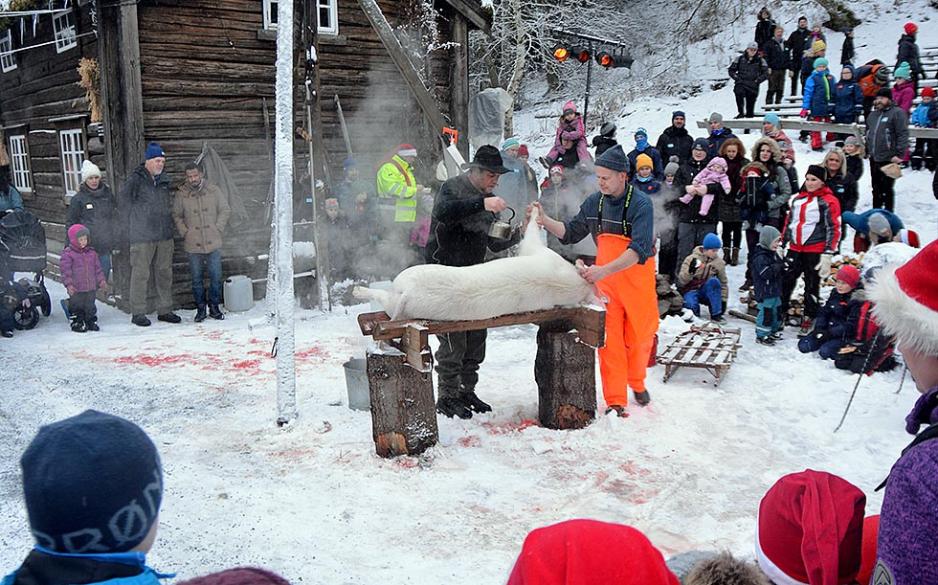 Noe som så ut til å fenge mange var griseslaktingen. Dette var en selvfølgelig del av juleforberedelsene i bygdene. Grisen som kom hit til «slakteplassen» var død ved ankomst. Så hylingen og skrikingen som fulgte med dette i gamle dager ble vi forskånet for. Men her fikk vi, som har opplevd den delen av førjulstrevet, oppfrisket minnene. Og de som ikke hadde sett en skikkelig griseslakting, fikk en ny opplevelse. Her ble det blant annet fortalt underveis hva de forskjellige delene av et griseslakt blir brukt til.