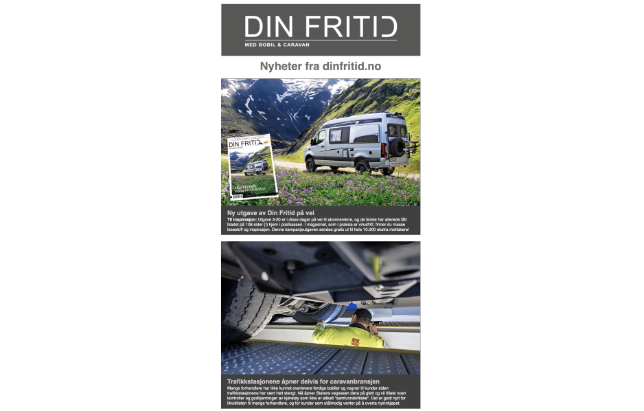 Med jevne mellomrom sender Din Fritid ut nyhetsbrev. Her får du et sammendrag av hva som har skjedd siden forrige nyhetsbrev. Meld deg på og sørg for at du ikke går glipp av det som skjer i caravanbransjen!