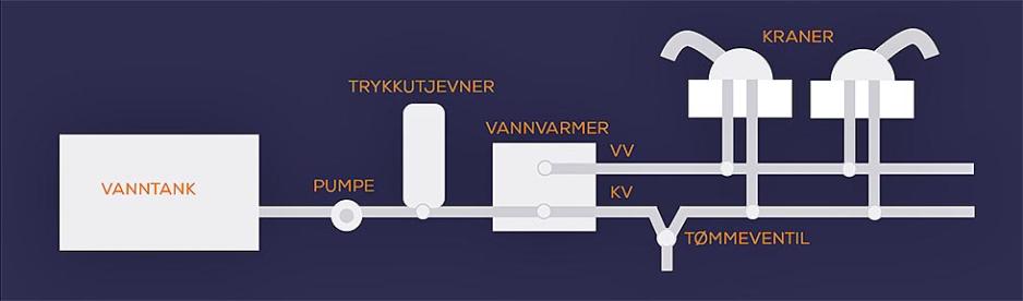 Vannanlegget i en moderne bobil er så komplisert, at et innblikk i virkemåte kan være til hjelp når anlegget skal tømmes. Vi viser her en forenklet prinsippskisse som viser hovedkomponentene.