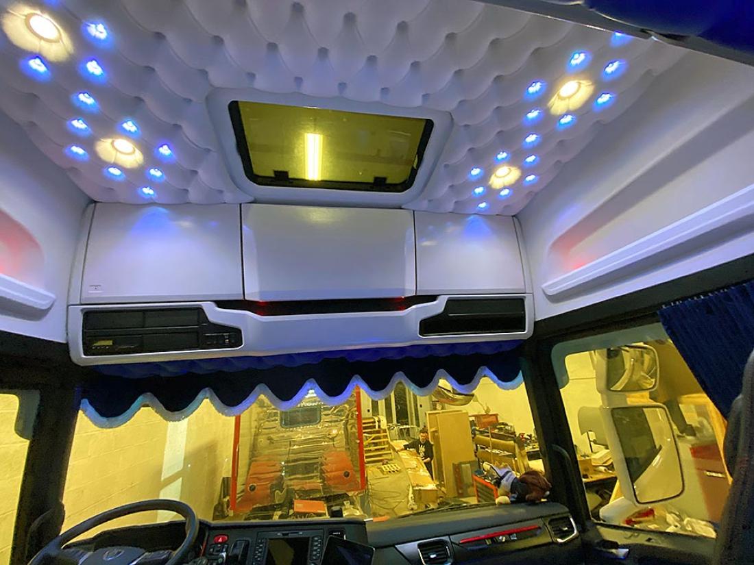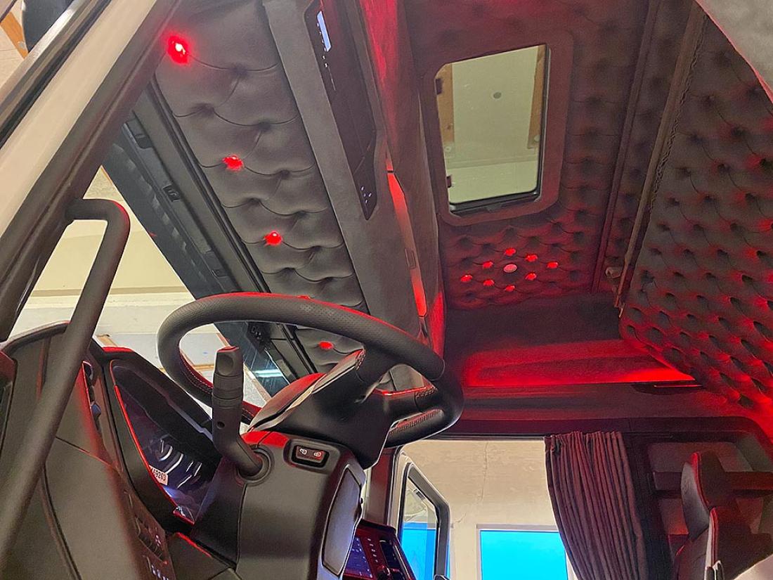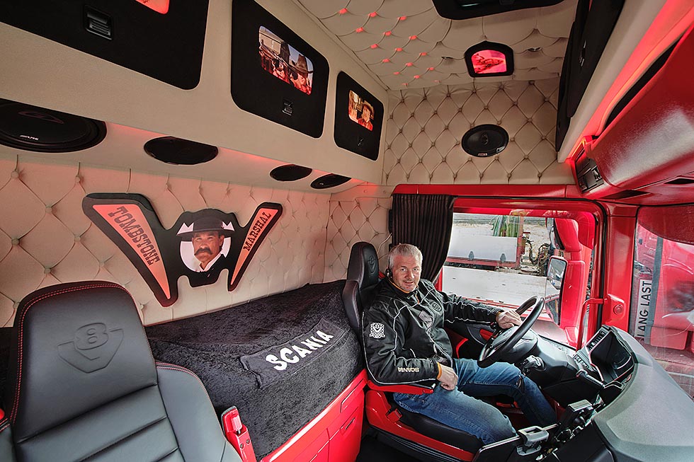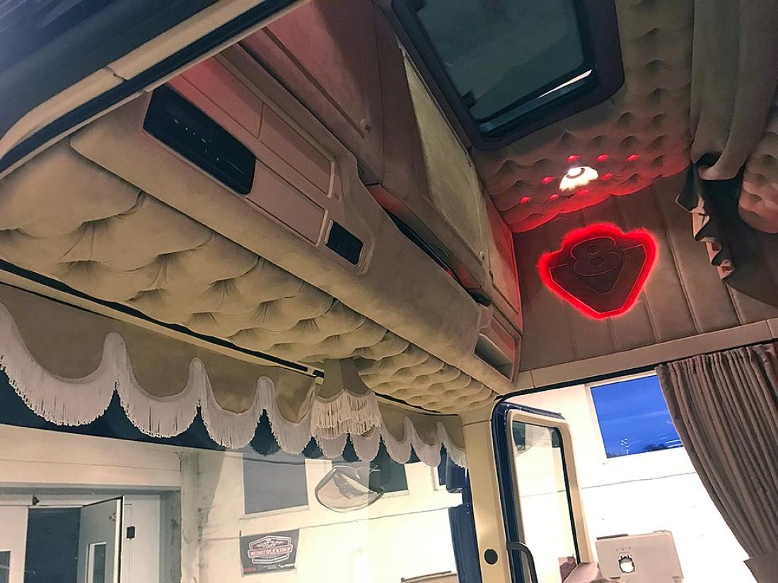 Gjermund tar godt vare på arbeidsplassen sin. Sko skal etterlates på utsiden når en klatrer inn i førerhuset fylt av farger, ledlys, lydanlegg, paddinger, skinntrekk på gulvet. Alt dette og mer til, dette er en livsstil.