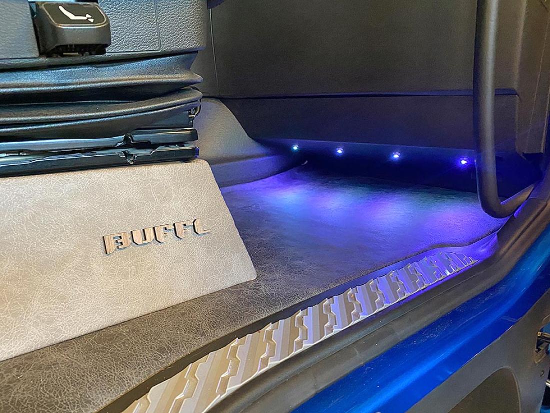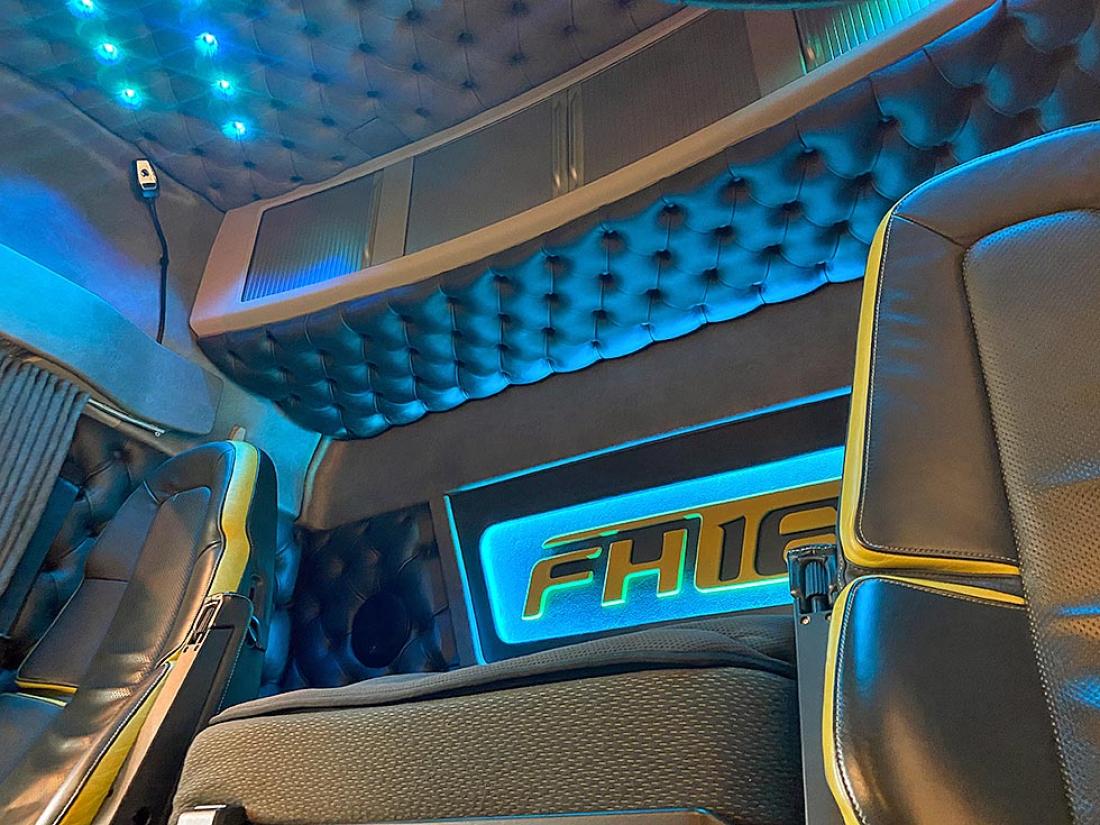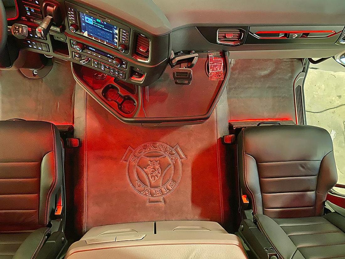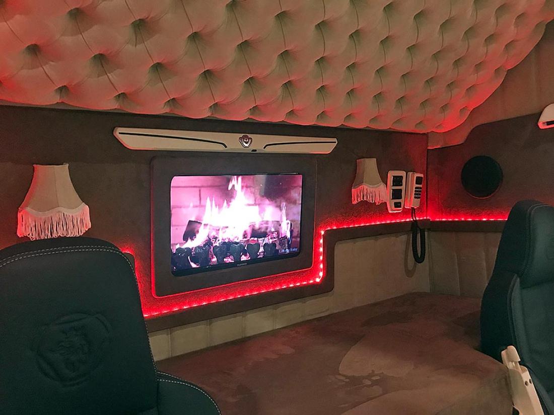 Gjermund tar godt vare på arbeidsplassen sin. Sko skal etterlates på utsiden når en klatrer inn i førerhuset fylt av farger, ledlys, lydanlegg, paddinger, skinntrekk på gulvet. Alt dette og mer til, dette er en livsstil.