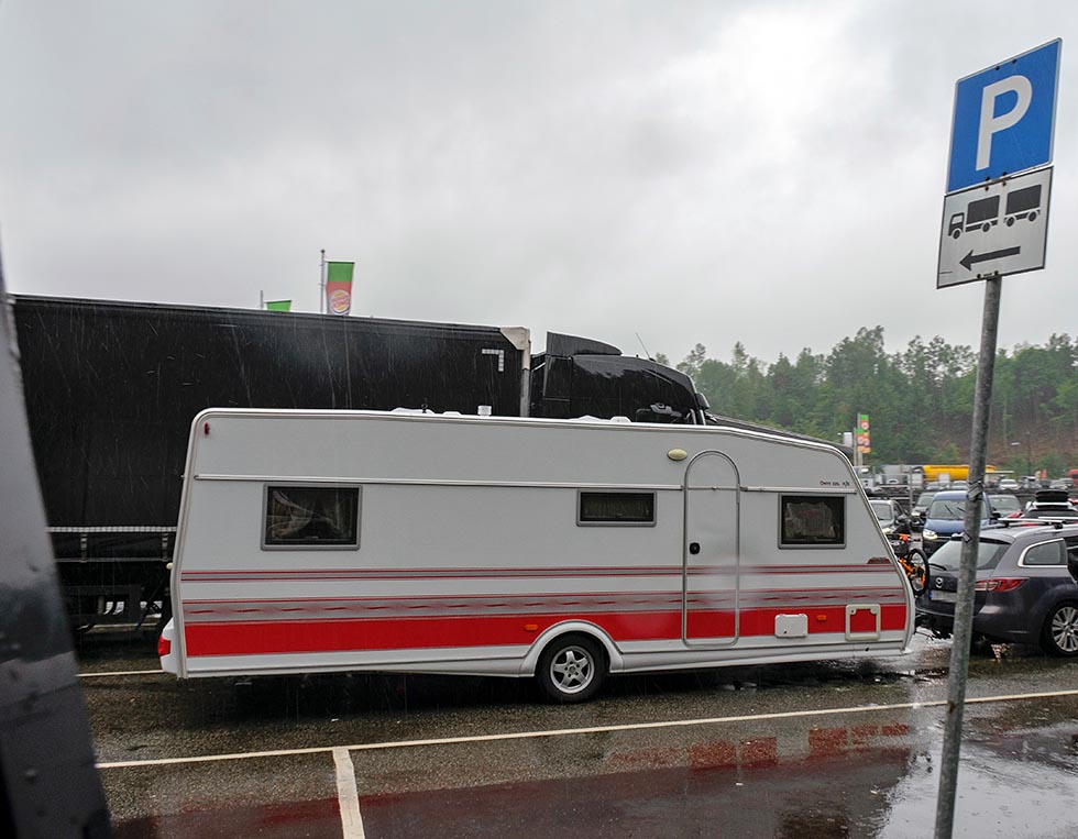 Rett ved skiltet som viser at parkeringen er forbeholdt vogntog og lastebiler har en bobil og en campingvognekvipasje parkert lags E18 når Din Fritid passerer rasteplassen.
