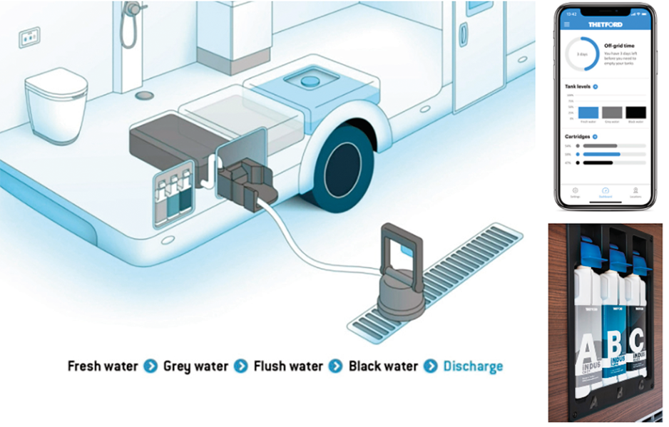 Juryens begrunnelse: Thetford lanserer et nytt, kassettfritt toalettanlegg med en fast svartvannstank i bilen. En slik løsning er normalt forbeholt store linere. Med iNDUS kan varigheten på tømmeintervallene tredobles, og du sparer vann, da systemet bruker gråvann. Toalettet kan nå plasseres hvor som helst i bilen, og vi gleder oss til å se hvordan produsentene vil utnytte dette i fremtiden!