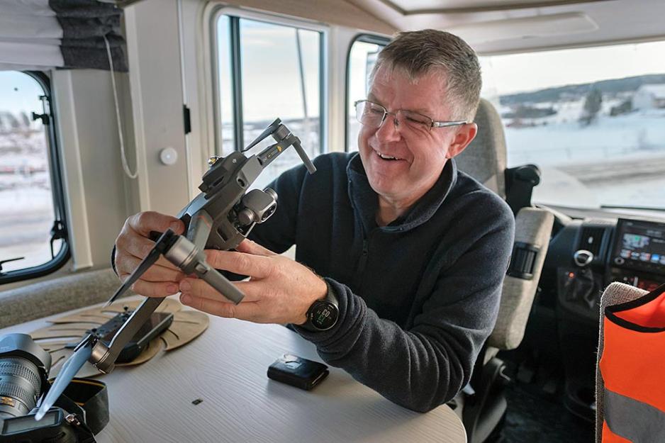 – Vi ville ha kontor og hotellrom på hjul, og vi ville ikke ha noe som hang etter bilen. En bobil kunne dekke vårt behov, og kombinert med utleie ville det være perfekt også økonomisk. Som tenkt, så gjort, forteller Anders engasjert, mens han sitter godt og varmt i bobilen og klargjør dronen for nye videoopptak.