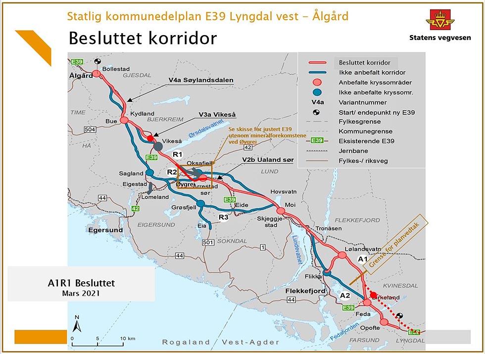 Regjeringen har valgt korridor for ny E39 mellom Lyngdal og Ålgård. Løsningen blir det såkalte R1-alternativet som går sør for Teksevatnet og via Vikeså gjennom Rogaland, og A1-alternativet via Lølandsvatn gjennom Agder. Denne løsningen har størst samfunnsøkonomisk nytte, og er best for natur og jordvern i Rogaland, hevder regjeringen i en pressemelding til Din Fritid.